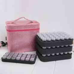 Smart opbevaringsboks med 126 bøtter med skruelåg til dine Diamond Paint sten. Der er to størrelser bøtter, som er henholdsvis 3 cm. og 5 cm. høje. Der er 3 lag med store bøtter i selve tasken og et lag med små bøtter i toppen. Selve tasken er lavet i et slidstærk materiale, som er vandafvisende og med et håndtag i toppen, så du nemt kan tage tasken med.